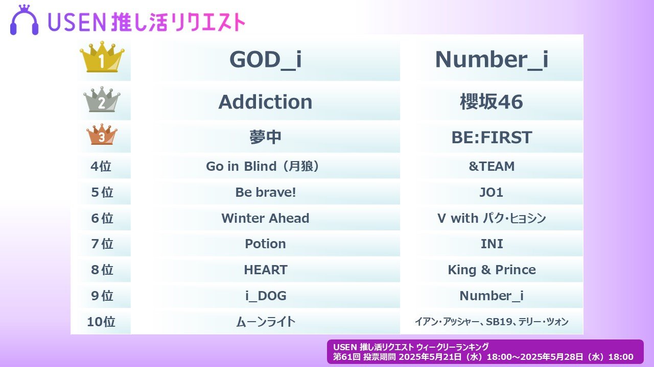 第61回 USEN 推し活リクエスト ウィークリーランキングはNumber_iの「GOD_i」が9週連続、15度目の1位を獲得。
